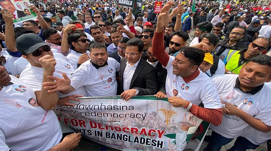 বাংলাদেশে গণতন্ত্র, মানবাধিকার ও আইনের শাসন প্রতিষ্ঠার দাবিতে লন্ডনে পদযাত্রা কর্মসূচি পালন করেছে যুক্তরাজ্য শাখা বিএনপি। মঙ্গলবার লন্ডনের হাইড পার্ক থেকে ১০ নম্বর ডাউনিং স্ট্রিট পর্যন্ত অনুষ্ঠিত এই পদযাত্রায় বিএনপির হাজার হাজার নেতাকর্মী অংশ নেন। যুক্তরাজ্যের বিভিন্ন শহর থেকে এসে পদযাত্রায় যোগ দেন দলটির নেতাকর্মীরা। অনেককে পরিবার-পরিজনসহ পদযাত্রায় অংশ নিতে দেখা যায়। পদযাত্রার বহর একপর্যায়ে কয়েক কিলোমিটার দীর্ঘ হয়ে যায়। এসময় নেতাকর্মীরা বর্তমান সরকারের পদত্যাগ দাবিসহ নানা স্লোগান দেন। অনেকে হাতে বাংলাদেশের জাতীয় পতাকা বহন করেন। পদযাত্রায় যোগ দেয়া একজন নারী বলেন, আমরা আজকের কর্মসূচিতে ২০ হাজার মানুষ অংশ নিয়েছি। বাংলাদেশে গণতন্ত্র পুনঃপ্রতিষ্ঠা, শেখ হাসিনার পদত্যাগ এবং তত্ত্বাবধায়ক সরকারের অধীনে সুষ্ঠু নির্বাচন দাবি করছি। কোলের সন্তান নিয়ে পদযাত্রায় অংশ নেয়া আরেক নারী বলেন, আজকে আমি আমার পরিবার ও বন্ধুদের নিয়ে আসছি। কারণ আমরা চাই না বাংলাদেশ যে গণতন্ত্রহীনতায় ভুগছে এই অবস্থা অব্যাহত থাকুক। আমাদের একটাই দাবি শেখ হাসিনাকে পদত্যাগ করতে হবে।