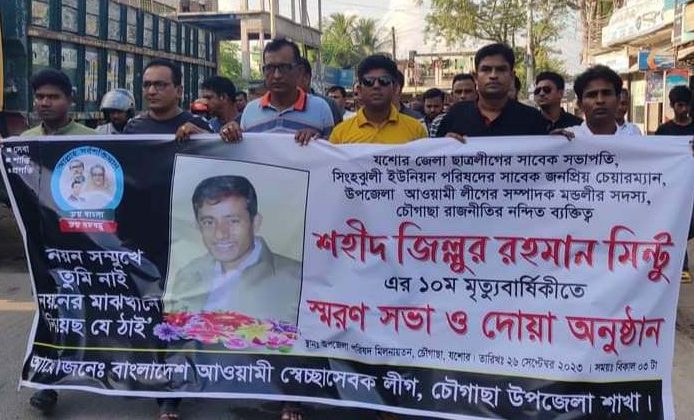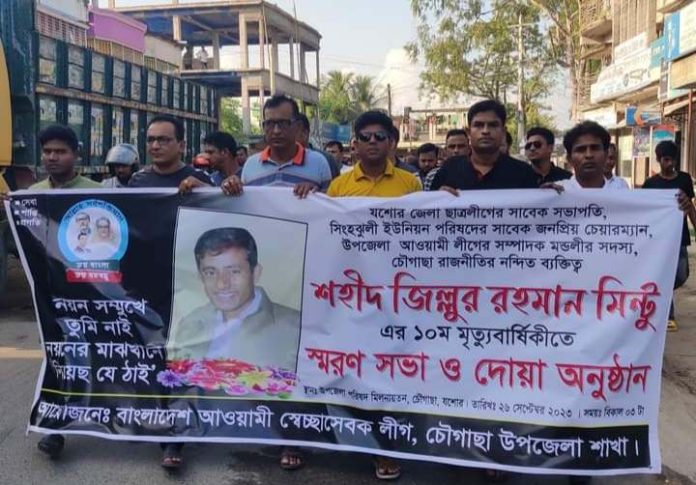 চৌগাছায় যশোর জেলা ছাত্রলীগের সাবেক সভাপতি ও চৌগাছার সিংহঝুলি ইউনিয়ন পরিষদের সাবেক চেয়ারম্যান জিল্লুর রহমান মিন্টুর ১০ম মৃত্যুবার্ষিকী পালন করা হয়েছে। মঙ্গলবার (২৬ সেপ্টেম্বর) উপজেলা স্বেচ্ছাসেবক লীগ ও ছাত্রলীগের আয়োজনে দিবসটি নানা কর্মসূচির মধ্য দিয়ে পালিত হয়। জিল্লুর রহমান মিন্টু ১৯৯৪-২০০২ পর্যন্ত যশোর জেলা ছাত্রলীগের সভাপতির দায়িত্ব পালন করেন। তিনি চৌগাছা উপজেলা পরিষদের প্রথম দু’বার নির্বাচিত চেয়ারম্যান উপজেলার পিতম্বরপুর গ্রামের মরহুম আতিউর রহমানের ছেলে। শহীদ জিল্লুর রহমান মিন্টুকে ২০১৩ সালের ২৬ সেপ্টেম্বর দুপুরে প্রকাশ্য দিবালোকে সিংহঝুলী শহীদ মশিয়ূর রহমান মাধ্যমিক বিদ্যালয় মাঠে গুলি করে হত্যা করে সন্ত্রাসীরা। তাঁর হত্যা মামলাটি আজও যশোর আদালতে বিচারাধীন রয়েছ। শহীদ মিন্টুর স্বরণে চৌগাছা উপজেলা ছাত্রলীগের উদ্যোগে তাঁর কবর জিয়ারত করেন। এরপর স্বেচ্ছাসেবক লীগ ও ছাত্রলীগের উদ্যোগে এক শোক র্যালী বের হয়। র্যালীটি শহরের বিভিন্ন গুরুত্বপূর্ণ সড়ক প্রদক্ষিণ শেষে উপজেলা পরিষদ চত্ত্বরে এসে শেষ হয়। সেখানে স্বেচ্ছাসেবক লীগের আয়োজনে দুপুরে উপজেলা পরিষদ মিলনায়তনে এক স্বরণসভা ও দোয়া মাহফিল অনুষ্ঠিত হয়। সভায় সভাপতিত্ব করেন উপজেলা স্বেচ্ছাসেবক লীগের সভাপতি ও শহীদ মিন্টুর সহোদর জিয়াউর রহমান রিন্টু।